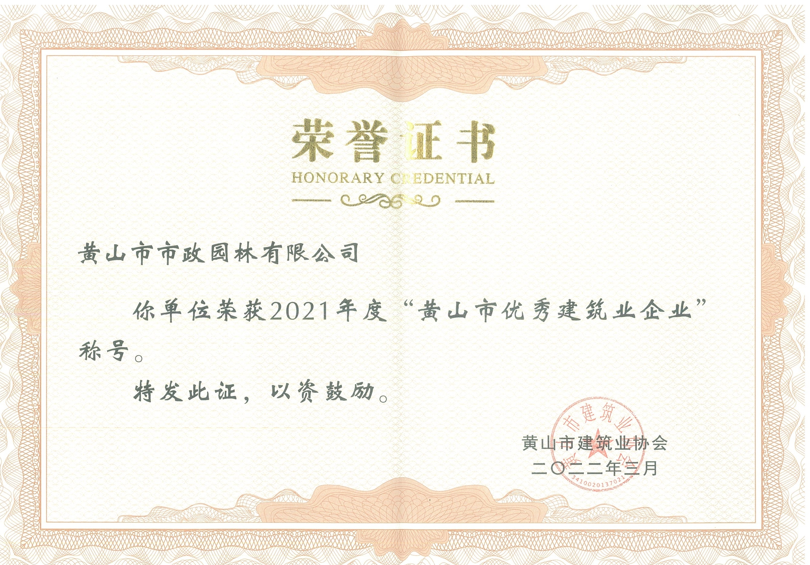 為提升我市建筑企業(yè)和工程項(xiàng)目整體管理水平,打造優(yōu)秀品牌,促進(jìn)我市建筑業(yè)高質(zhì)量發(fā)展。3月17日,黃山市建筑業(yè)協(xié)會(huì)發(fā)布《關(guān)于公布2021年度黃山市建筑業(yè)企業(yè)等評(píng)優(yōu)名單的通知》,黃山市市政園林有限公司被授予“2021年度黃山市優(yōu)秀建筑企業(yè)”榮譽(yù)稱號(hào)。